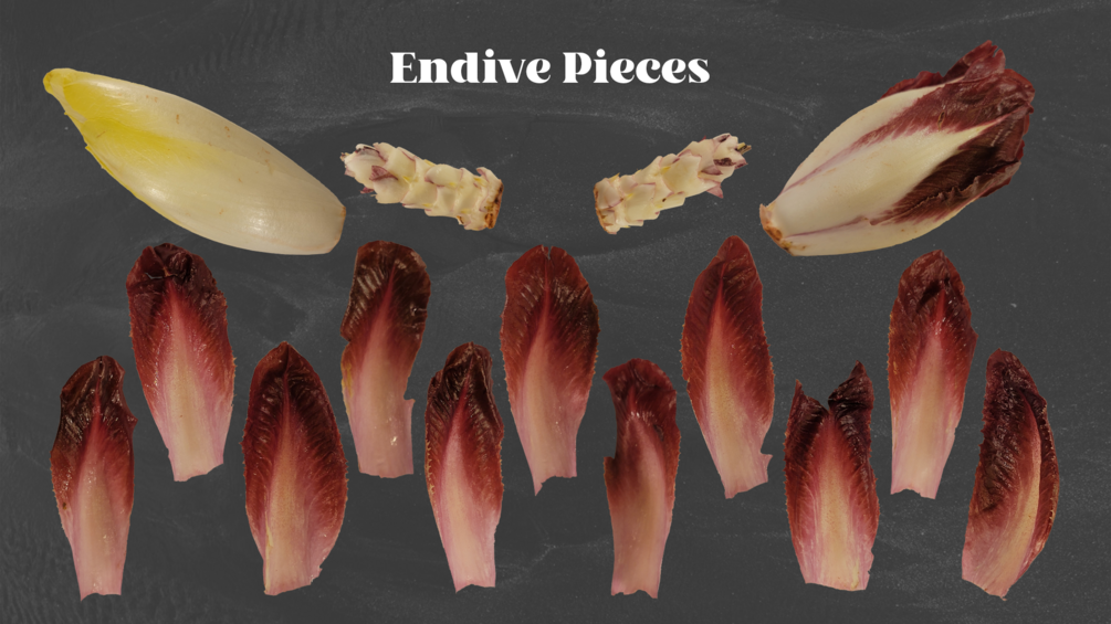 ◦ 11 red endive leaves, 2 endive stems, 1 full red endive, and 1 full yellow endive