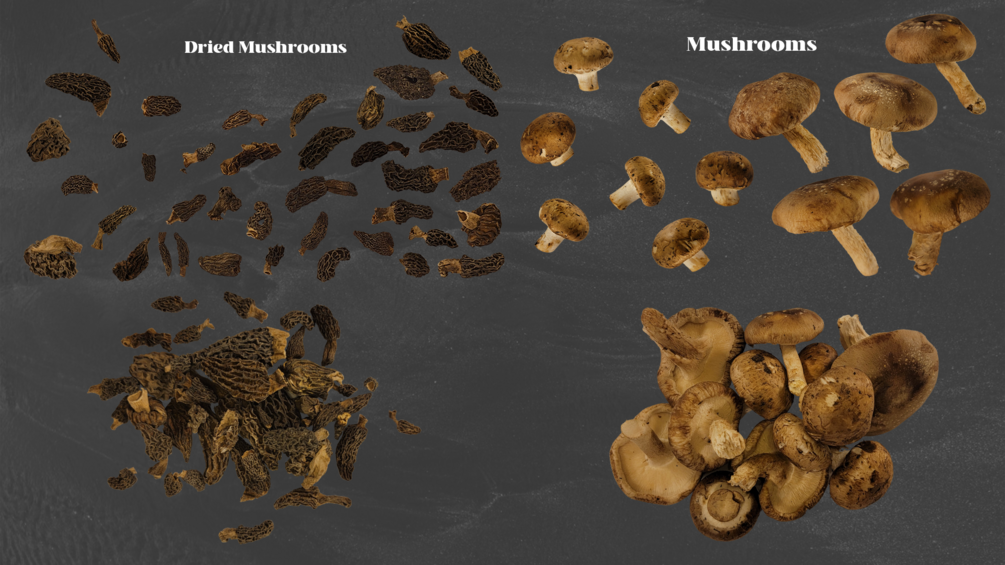 ◦ 7 cremini mushrooms, 5 shitake mushrooms, 41 dried morrel mushrooms, 1 pile of cremini/shitake mushrooms, and 1 pile of dried morrel mushrooms